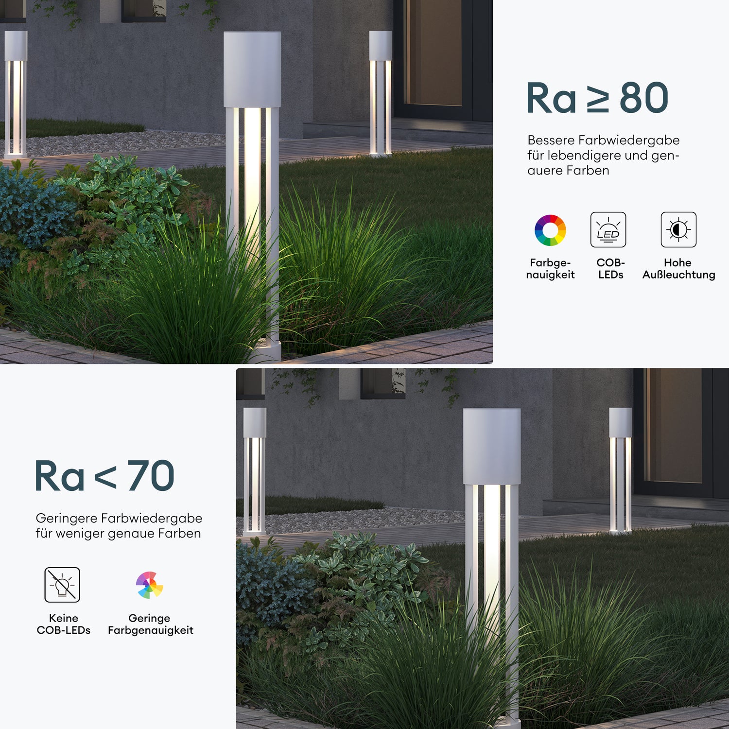 • Hochwertige Materialien: Die Außenlampen sind mit einer speziellen Pulverbeschichtung versehen. Und Aluminiumboden ist sehr Rostresistent und stabi.