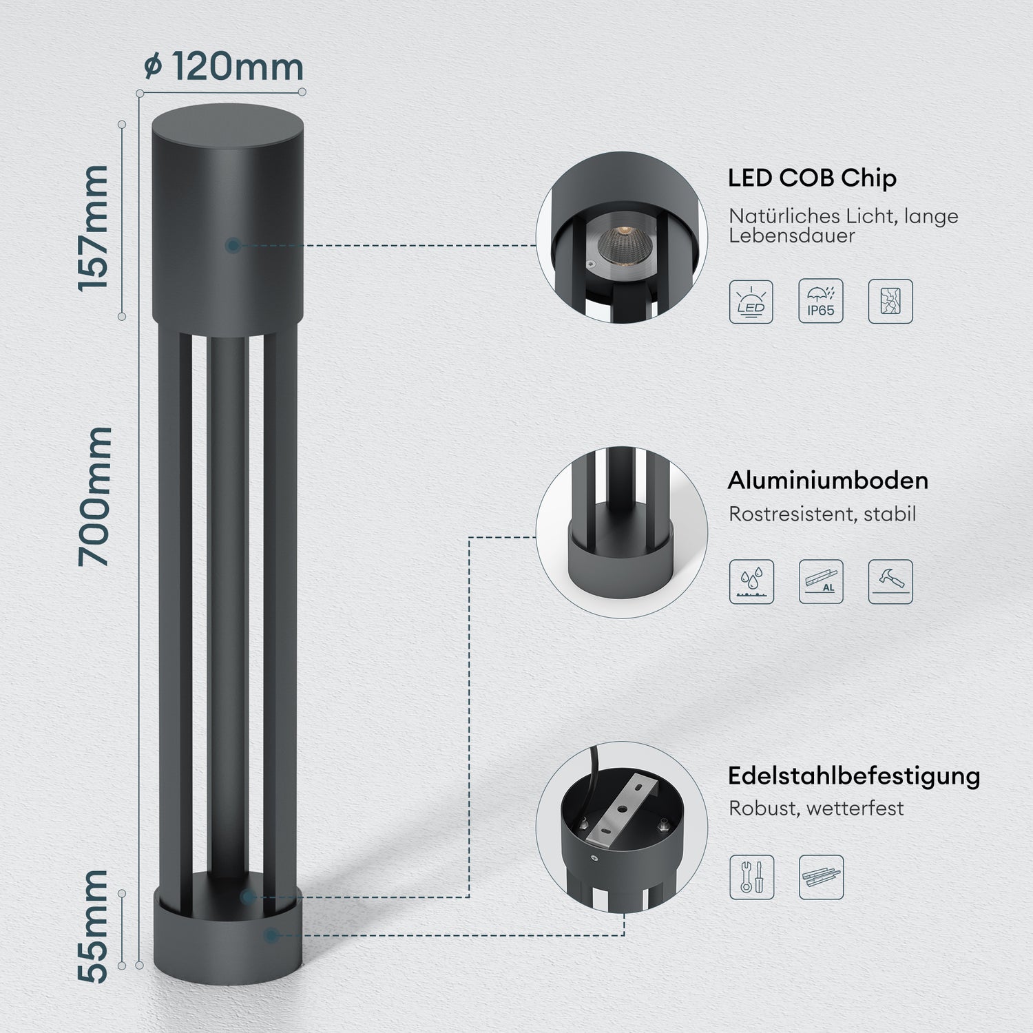 glasvilla Außenleuchte ⌀120xH700mm IP65 Wegeleuchte Außen | Pollerleuchte für Garten, 3000K Stehlampe Gartenlampe | Außenlampe Standleuchte 10W NeoForge