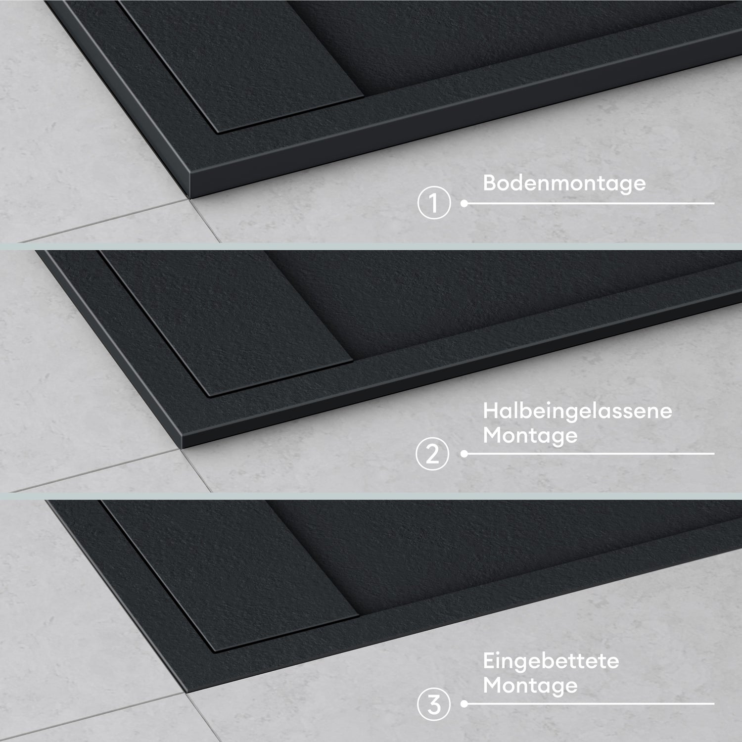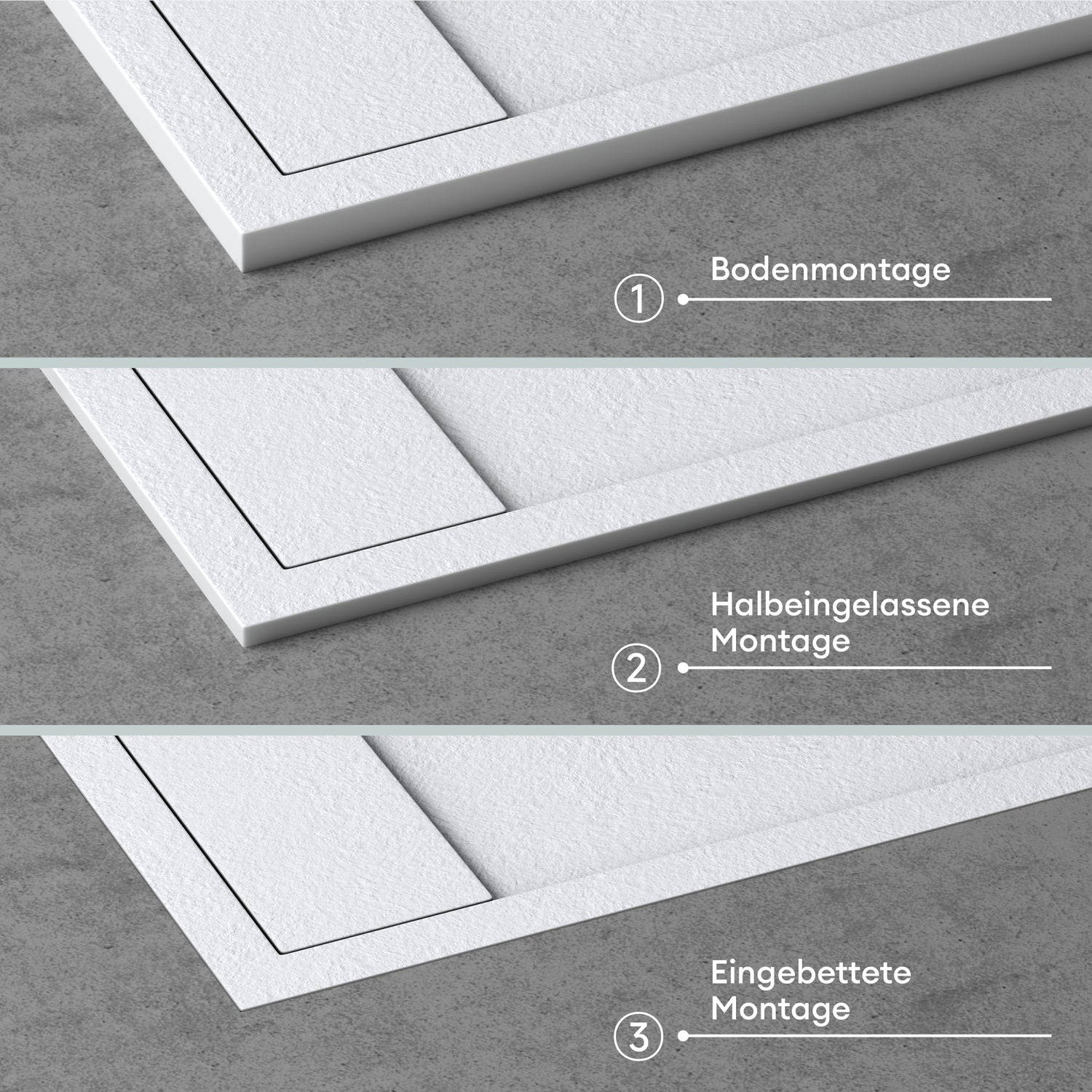 - Bodenebene, halbeingelassene, eingebettete Montage möglich