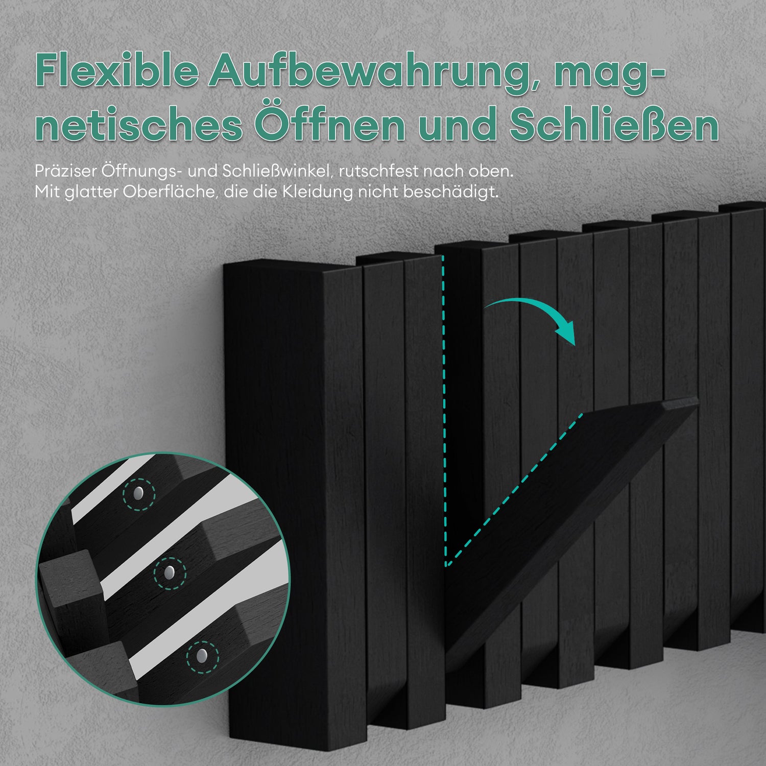 Gracias a su sistema de ganchos abatibles magnéticos, el perchero permanece totalmente plano cuando no se utiliza, optimizando el espacio y manteniendo una estética limpia. La estructura reforzada permite una capacidad de carga excepcional de hasta 100 kg mediante montaje atornillado.