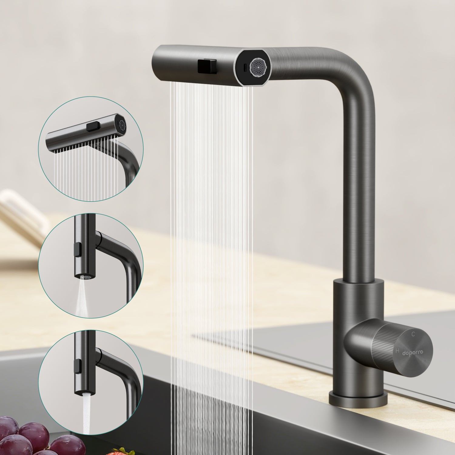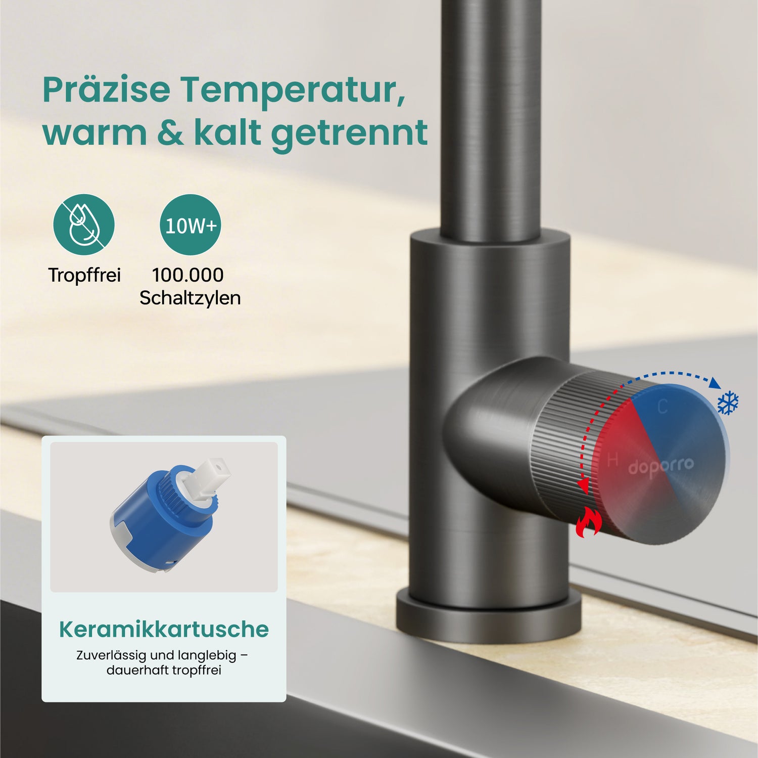 - Ausziehbarer Brause: Mit 360° drehbarem, verdecktem Sprühkopf, der sich bis zu 150 cm ausziehen lässt und so das gesamte Spülbecken oder mehrere Bereiche mühelos abdeckt.