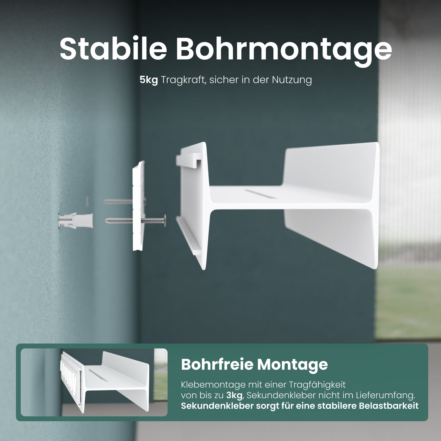- Stabile und einfache Montage: Wahlweise Klebemontage bis 3 kg oder Bohrmontage bis 5 kg. Alle erforderlichen Zubehörteile außer dem Sekundenkleber sind im Lieferumfang enthalten.