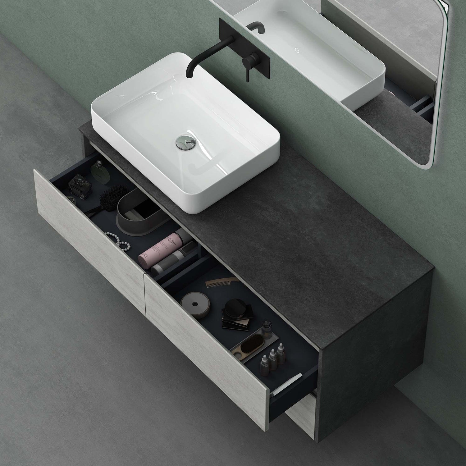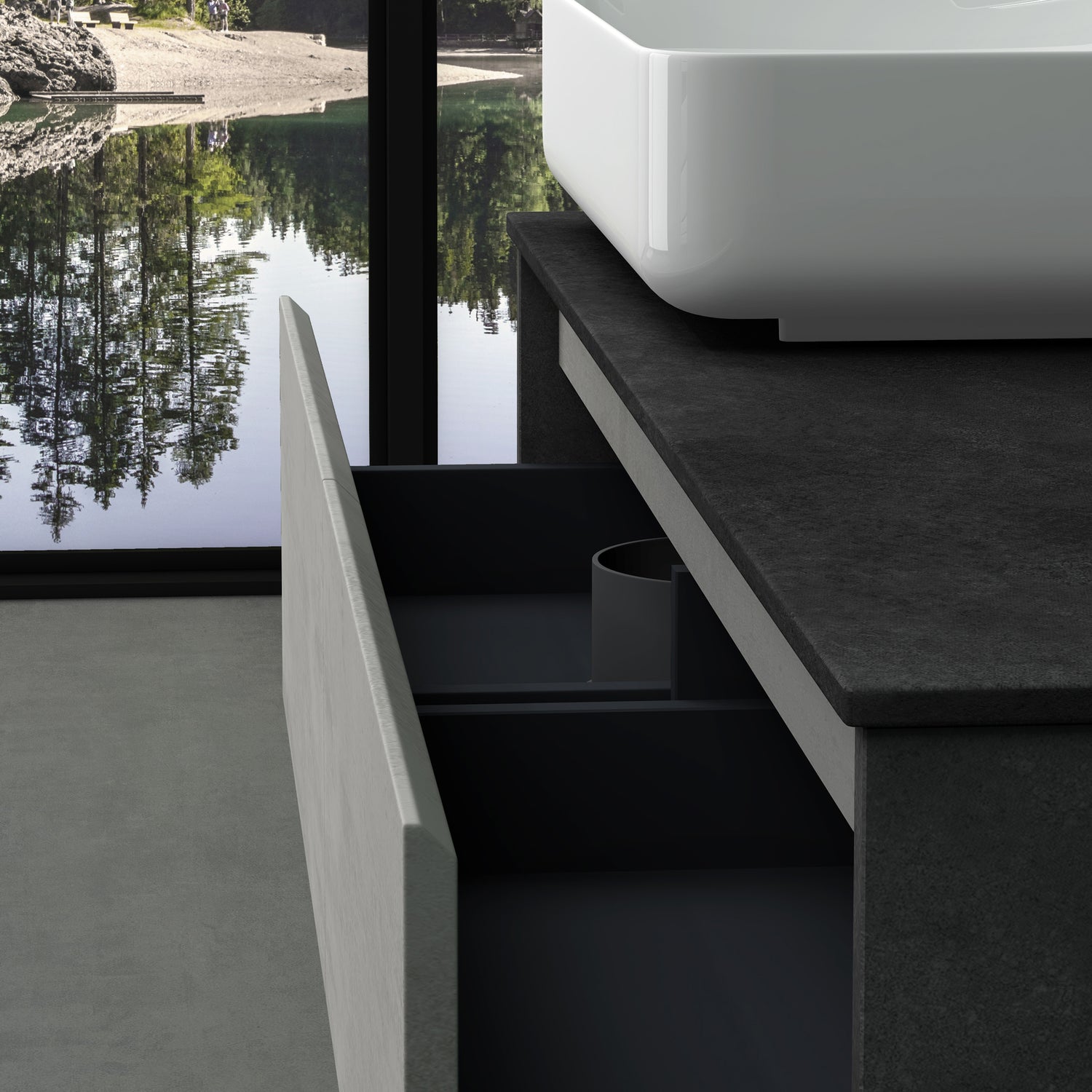 Die Oberfläche der Platten ist feuchtigkeitsbeständig und sorgt für eine besondere Haptik. Durch die um 45° abgeschrägte Griffe lassen sich die Schubladen leichter öffnen und schließen.