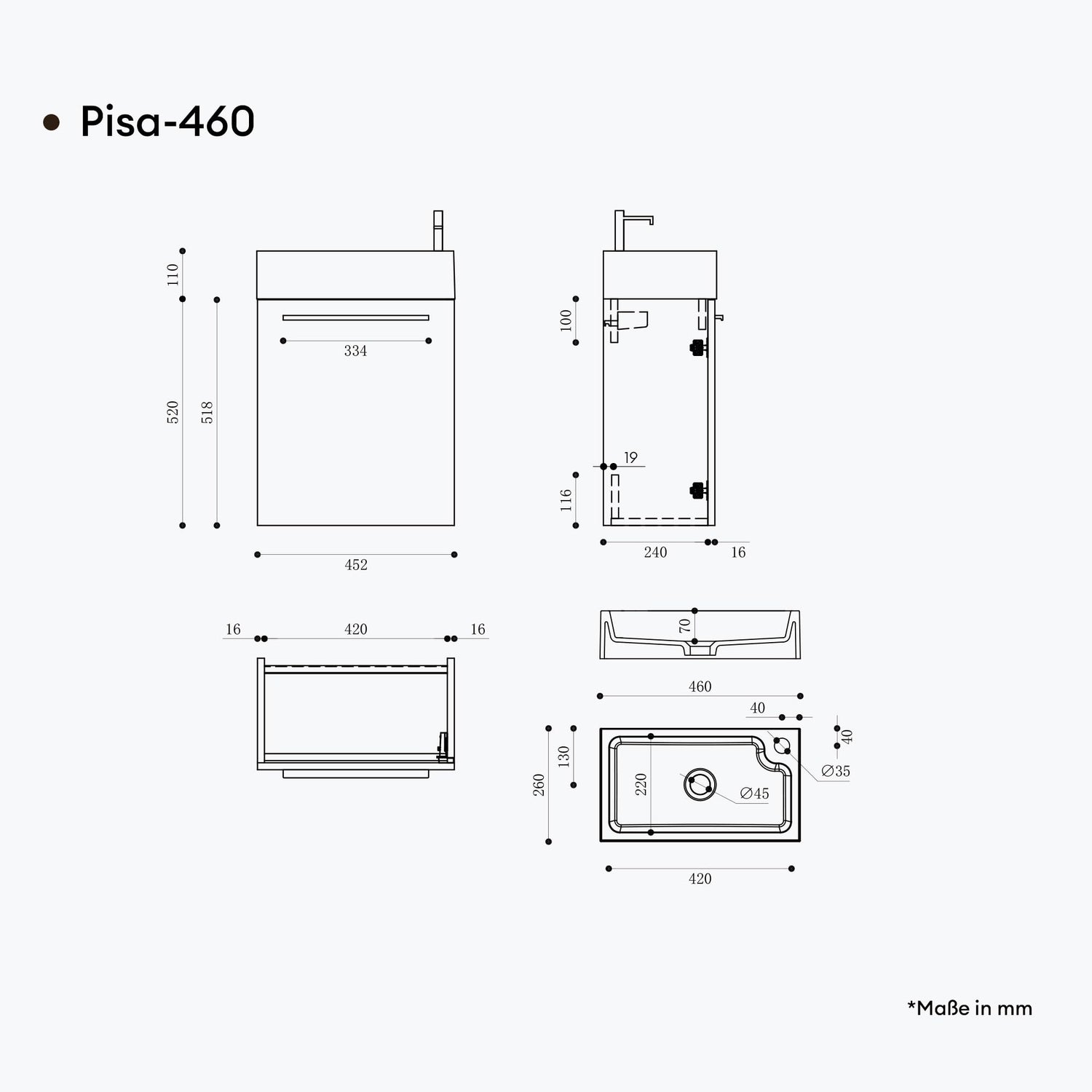 Das Bademöbelset Pisa ist perfekt kombiniert, das Waschbecken passt wunderbar zum Waschbeckenunterschrank.