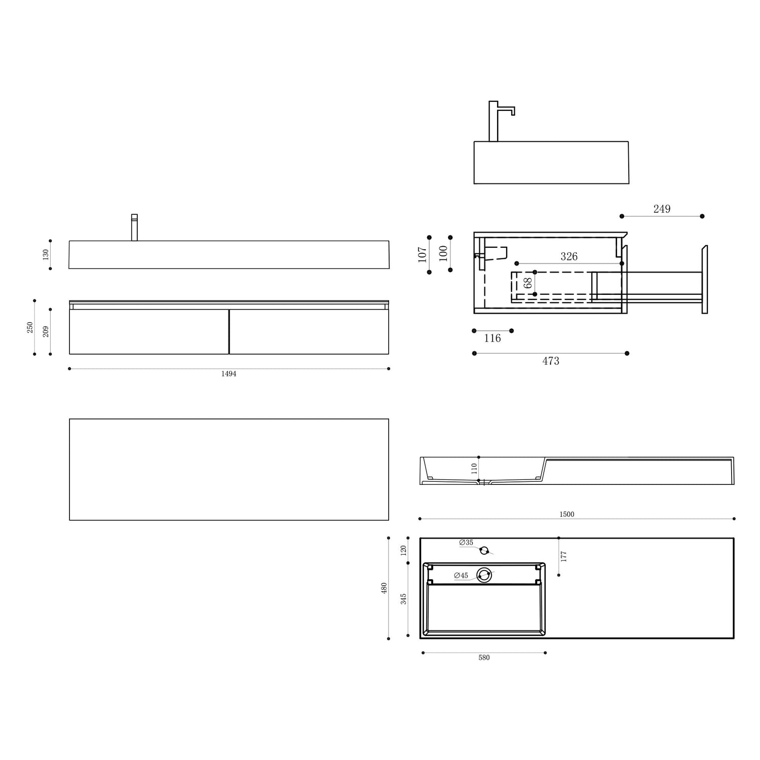 glasvilla Badmöbelset Waschtisch mit Unterschrank 150x48x25cm mit Soft-Close Schubladen inkl. Mineralguss-Waschbecken UP
