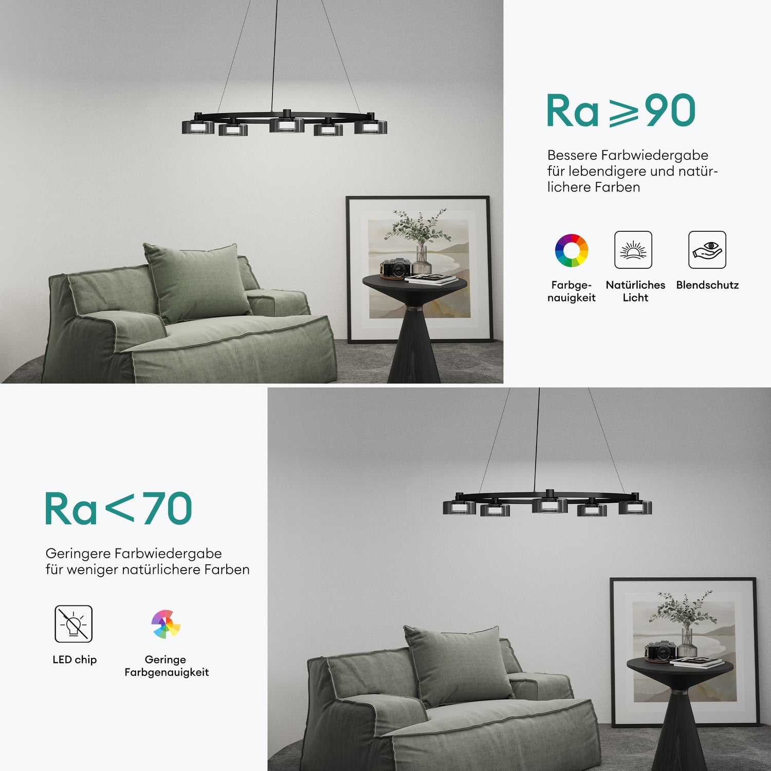 Die Leuchte mit einem RA-Wert ≥ 90 sorgt für eine natürliche und authentische Beleuchtung, die Farben lebendig und präzise darstellt.