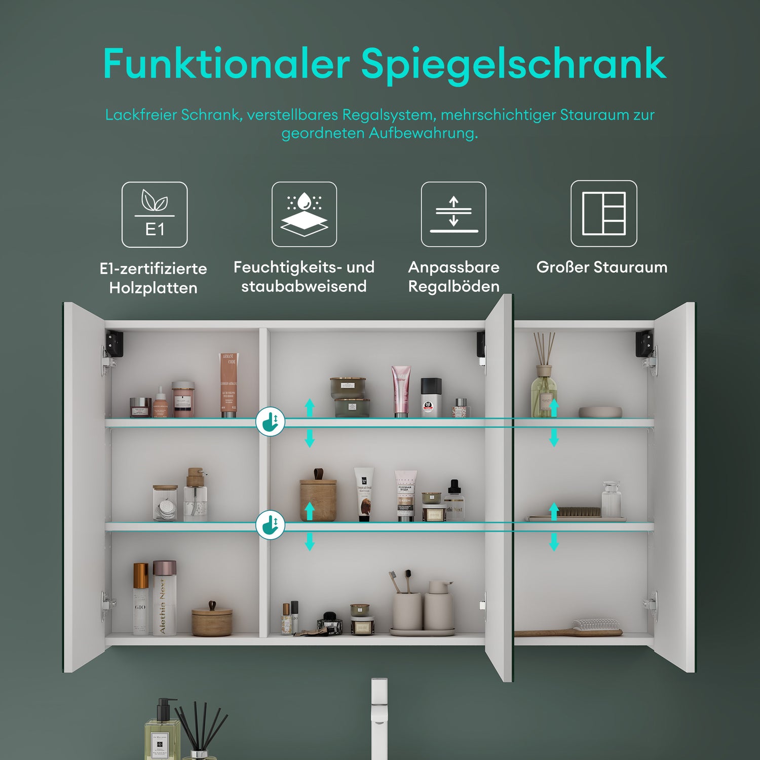 Der Spiegelschrank verfügt über mehrere Fächer, die reichlich Stauraum bieten. Und die Trennwände im Inneren des Schranks können je nach Bedarf in der Höhe verstellt werden.