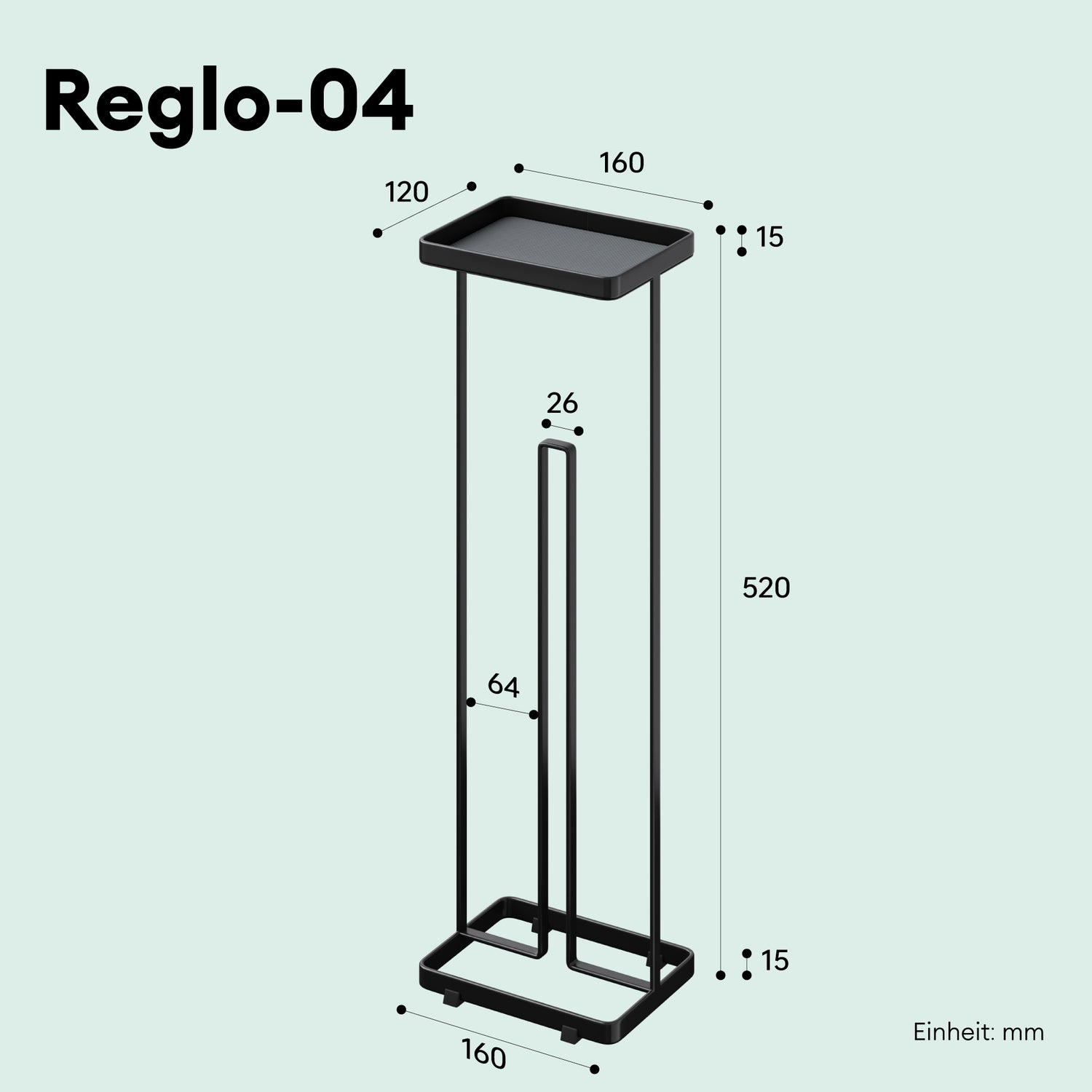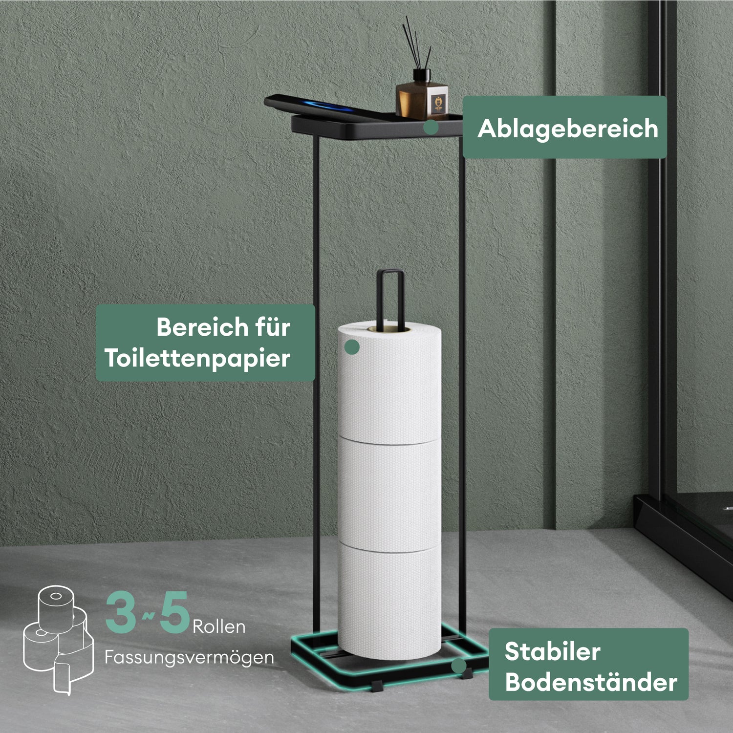 - Design Toilettenpapierhalter stehend: Maße(BxTxH): 160x120x520 mm | 3~5 Rollen Fassungsvermögen | Max. Rollen-Durchmesser: 154mm