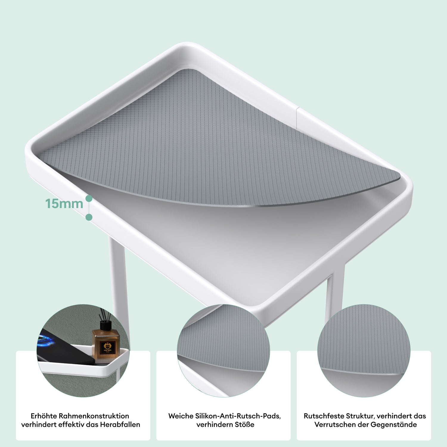 - Praktische Ablage: Integrierter Ablagebereich zur Aufbewahrung von Smartphones oder kleinen Dekorationsgegenständen. Erhöhte Rahmenkonstruktion und rutschfeste Silikonpads verhindern ein Verrutschen der Gegenstände
