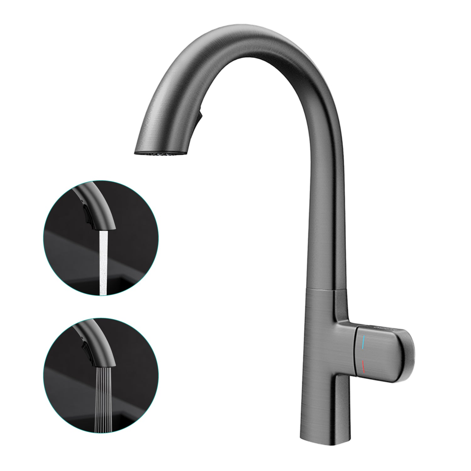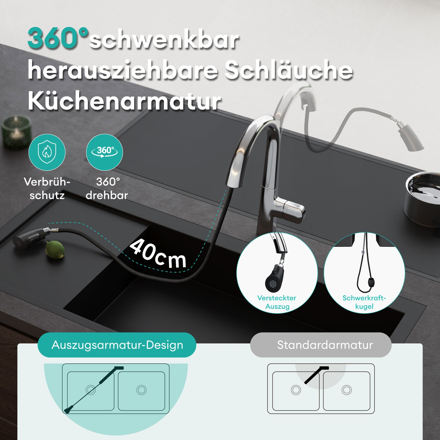 - Ausziehbarer Brause: Mit 360° drehbarem, verdecktem Sprühkopf, der sich bis zu 40 cm ausziehen lässt und so das gesamte Spülbecken oder mehrere Bereiche mühelos abdeckt